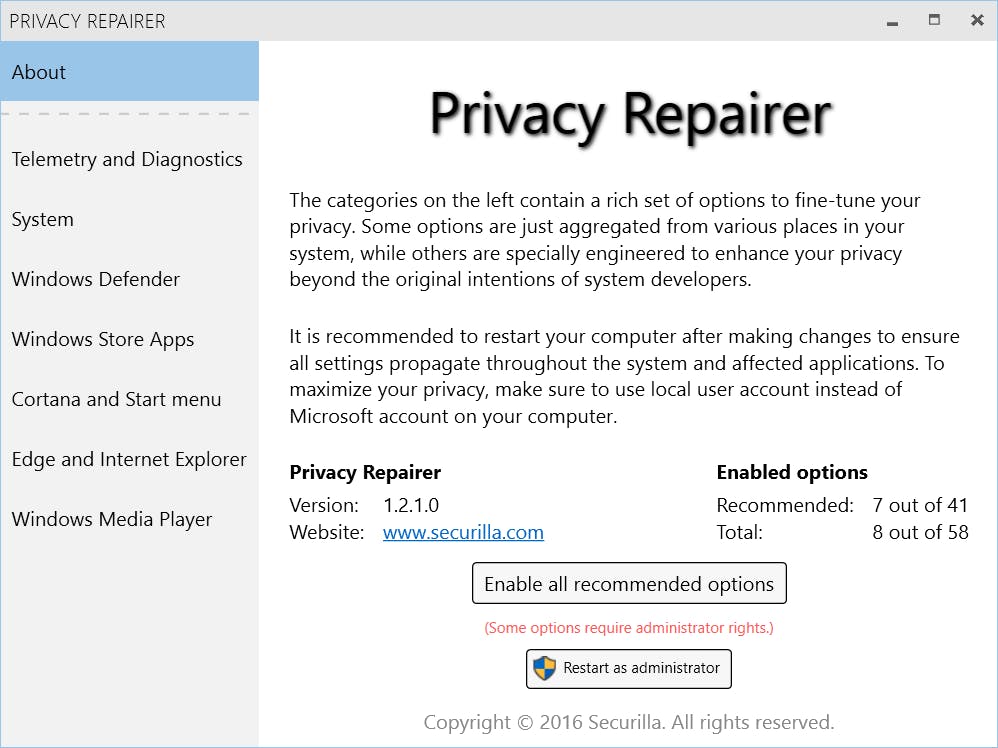 Windows 10 verzamelt allerlei gegevens over jou en je computergebruik. De meeste instellingen zijn in Windows zelf aan te passen, maar je moet wel van zoeken houden om alle opties te vinden. Privacy Repairer geeft je direct toegang tot alle instellingen die ertoe doen. Start Privacy Repairer en klik op Restart as administrator om alle opties zichtbaar te maken. Je kunt de instellingen stuk voor stuk nalopen door tabbladen als System, Windows Store Apps of Telemetry and diagnostics te openen. Je vindt hier een aan-uitschakelaar. Bij veel instellingen staat de opmerking Recommended, waarmee de makers aangeven dat ze adviseren om de optie te activeren. Met de knop Enable all recommended options worden de belangrijkste privacyvriendelijke-opties automatisch voor je ingesteld. Wij raden je wel aan om alle instellingen zelf na te kijken. Hoewel je je aanpassingen ook weer snel ongedaan maakt, is het voor sommige mensen niet aan te raden om bijvoorbeeld OneDrive volledig uit te schakelen (als je dit onderdeel gebruikt). Sommige aanpassingen hebben de aanduiding Expert only waarmee gewaarschuwd wordt dat de instellingen niet zonder risico zijn. Een voorbeeld hiervan is het uitschakelen van Windows Update, een essentieel onderdeel van Windows 10 om je computerveilig te houden.