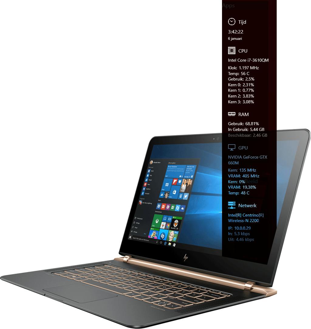 Als je gelijktijdig op Ctrl+Shift+Esc drukt, krijg je Windows Taakbeheer te zien. In het tabblad Prestaties zie je informatie over onder andere de belasting van je processor, de status van je wifi en het werkgeheugen. Als je systeem regelmatig traag aanvoelt of ‘hangt’, kun je in het tabblad in het tabblad Processen zien welk programma de overbelasting veroorzaakt. SideBarDiagnostics is handig omdat het programma je continu op de hoogte houdt van de belasting van essentiële hardware. De informatie wordt getoond in een subtiele zijbalk. Kijk bij de instellingen om aan te geven welke informatie je wilt zien. Hierdoor houd je de informatiebalk overzichtelijk en zie je geen overbodige onderdelen, zoals netwerkadapters die niet in gebruik zijn.