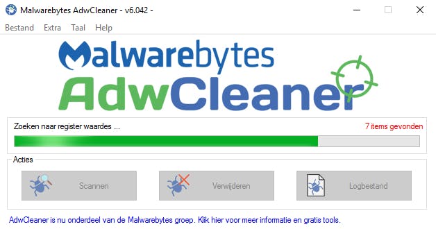 AdwCleaner is al eerder besproken, maar omdat het programma nu in handen is van de bekende softwarebeveiliger Malwarebytes, brengen we het graag opnieuw onder je aandacht. AdwCleaner is een uitstekend programma om je systeem te laten onderzoeken op probleemsoftware. Je hebt AdwCleaner niet nodig als je computer goed functioneert, maar wel als je browser zicht vreemd gedraagt of als je het gevoel hebt dat je systeem ‘iets onder de leden’ heeft. Start AdwCleaner en klik op Scannen om je computer te onderzoeken. Het programma voert een grondige controle uit.