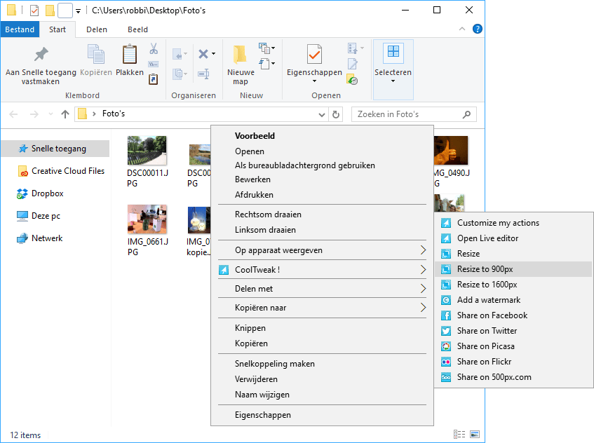 Voor echt geavanceerde fotobewerkingen heb je Photoshop of een ander grafisch pakket nodig, maar soms is dit te veel van het goede. Denk hierbij aan het toevoegen van bijvoorbeeld een watermerk of als je snel een afbeelding kleiner wilt maken. CoolTweak biedt een handige oplossing om deze en vele andere bewerkingen vanuit de Windows Verkenner te regelen. Klik met de rechtermuiskop op een fotobestand (of selectie foto’s) en kies CoolTweak. Er verschijnt een tweede menu om een snelle fotobewerking uit te voeren. Staat de gewenste bewerking niet in het lijstje? Klik op Customize my actions en stel een nieuwe bewerking in.