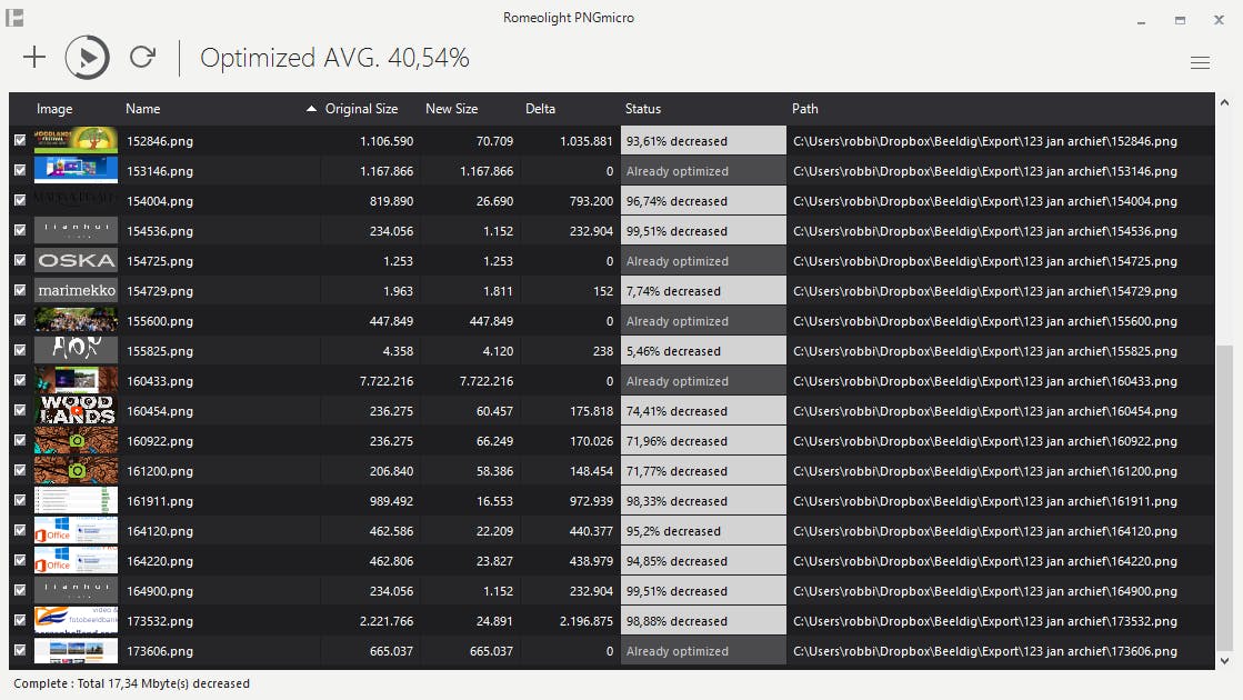 Via www.tinypng.com kun je png-afbeeldingen snel verkleinen, meestal zonder zichtbaar kwaliteitsverlies. De resolutie blijft behouden, maar de omvang gaat aanzienlijk omlaag. Er is een commerciële Photoshop-uitbreiding beschikbaar voor deze dienst, maar het kan dankzij PNGmicro ook gratis. Start het programma, sleep de afbeeldingen die je wilt verkleinen naar het PNGmicro-venster en druk op de Play-knop. Je ziet direct de bestandsomvang omlaag schieten. Het is niet vreemd om een afbeelding van 1 MB te zien slinken naar 200 Kb. We horen je denken: ‘Ik gebruik jpg’s in plaats van png’s’. Ook dat kan, dan heb je van dezelfde makers JPEGmicro nodig. De png-indeling heeft in veel gevallen onze voorkeur omdat teksten en lijnen beter worden weergegeven, zelfs in verkleinde afbeeldingen.