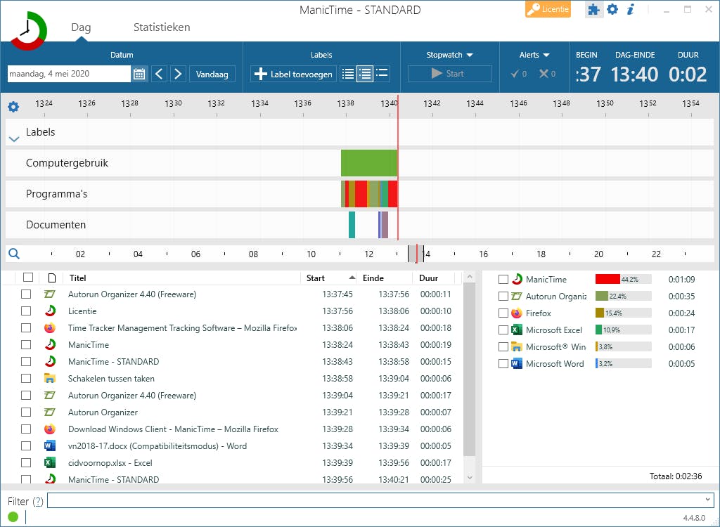 Het is technisch mogelijk om aan de hand van bijvoorbeeld Windows-logboeken en de browsergeschiedenis te achterhalen wat er met een computer is gebeurd in de afgelopen uren, maar echt makkelijk is dat niet. ManicTime biedt echter een oplossing. Dit programma houdt continu bij welke bestanden er zijn geopend, welke programma’s hoeveel procent van de tijd hebben gedraaid en welke websites zijn bezocht. Deze gegevens worden bovendien bij elkaar opgeteld, zodat je aan het eind van de dag bijvoorbeeld precies weet hoeveel uur je aan een bepaald document hebt gewerkt. Dat is handig voor zakelijke gebruikers die op uurbasis moeten factureren en zo snel en automatisch die gegevens kunnen inzien. Het is echter ook handig voor wantrouwige mensen die graag willen weten of er iets met hun pc is gebeurd toen ze even koffie gingen halen.