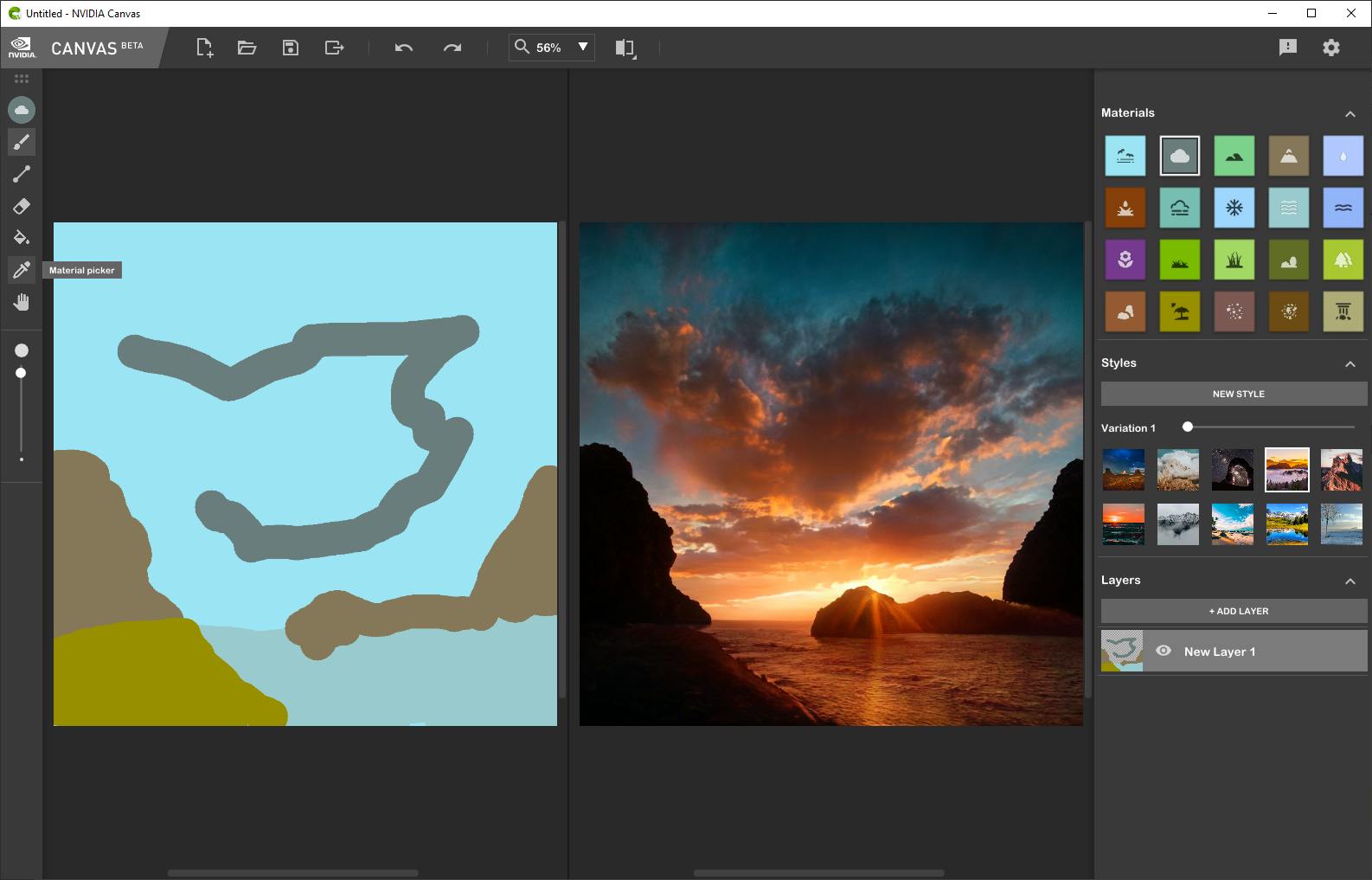 Canvas toont je twee vensters en een palet met landschapselementen, zoals zand, modder, heuvels, bergen, wolken, bloemen en bomen. Hiermee kun je links een ruwe schets maken om aan te geven waar je deze elementen in je ‘foto’ wilt zien en de kunstmatige intelligentie achter het product probeert er vervolgens iets geloofwaardigs van te maken.