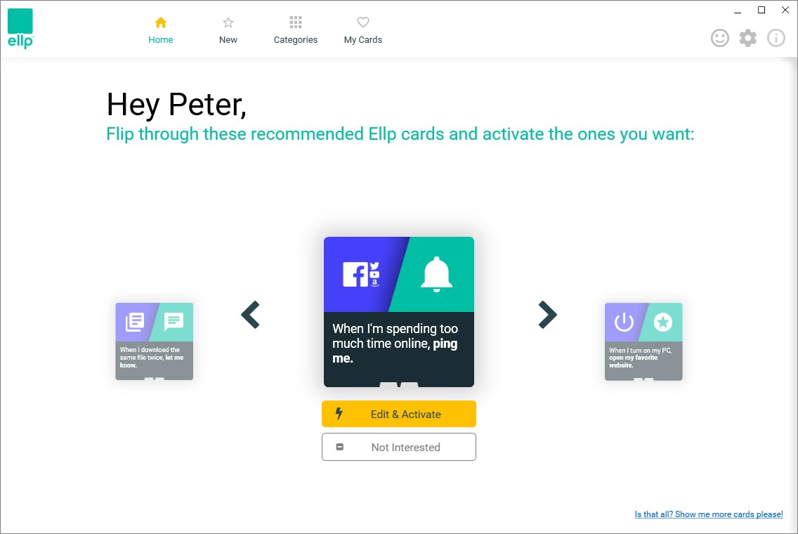 Ellp is een moderne assistent voor je pc, die taken kan uitvoeren op het gebied van productiviteit, beveiliging en prestatie. Iedere categorie heeft een aantal kaarten met ingestelde taken die je kunt kiezen. Ellp kan je bijvoorbeeld een waarschuwing geven als je te veel op Facebook, Twitter of YouTube zit. Of je op de hoogte stellen als je e-mailadres voorkomt in een lijst van gehackte gegevens. En als je favoriete site een nieuwe foto plaatst, kan Ellp hem als achtergrond instellen op je bureaublad. Het werkt eigenlijk precies als Iftt.com, de populaire site waarmee je “slimme” online diensten aan elkaar kunt koppelen. Alleen werkt Ellp lokaal op je pc. Het programma ziet er gelikt uit, en werkt heel gebruiksvriendelijk. Je kiest een kaart, vult de gevraagde gegevens in (bijvoorbeeld het tijdstip waarop je de weersvoorspelling wilt horen) en klikt op Activate Card. Het werkt handig en snel, en kan je computergebruik een stuk aangenamer maken.
