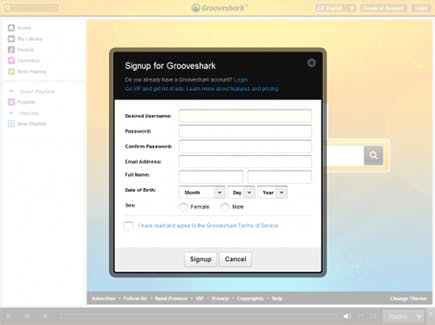 Open uw browser en surf naar Grooveshark. Klik helemaal rechts bovenaan op de knop Create an account. Voer nu de gevraagde gegevens in en plaats een vinkje bij I have read and agree to the Grooveshark Terms of Service. Klik vervolgens op de Signup-knop. U bent nu aangemeld en krijgt onmiddellijk de vraag om vrienden uit te nodigen. Indien u dat wilt doen, klikt u op Invite friends. Voer zoveel e-mailadressen in als u zelf wilt of voer uw Google-account en -wachtwoord in om Grooveshark-uitnodigingen naar al uw Gmail-contacten te versturen. Wilt u liever zelf aan de slag met Grooveshark zonder anderen lastig te vallen, dan klikt u op Great!. U wordt nu terug naar het beginscherm verwezen. Wanneer u helemaal rechts bovenaan op uw profielnaam en vervolgens op Settings klikt, kunt u uw profiel aanvullen. Via My Profile Picture kunt u bijvoorbeeld een profielfoto uploaden. Uw wachtwoord wijzigen of de instellingen voor Grooveshark-berichten aanpassen kan ook op deze pagina.