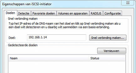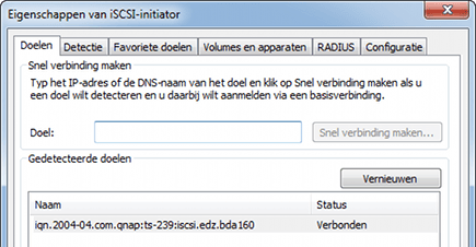Om de opslagruimte die via iSCSI op de NAS is gemaakt ook echt te gebruiken, moet nu de iSCSI-Initiator op de pc worden geconfigureerd. Dit gaat in Windows 7 het snelste door via het zoekscherm in het menu Start te zoeken op iSCSI en daarna de iSCSI-initiator te starten. Typ op het tabblad Doelen het ip-adres van de NAS waarop de iSCSI-Target is geconfigureerd en klik op Snel verbinding maken. Als er maar één iSCSI-target is op de NAS, dan is selecteren genoeg. Klik op Gereed. Zijn er meerdere iSCSI-doelen, dan moet u met ieder doel apart een verbinding maken via Verbinding maken. Zolang Target en LUN ongewijzigd blijven, zal Windows telkens wanneer de pc wordt gestart, de verbinding met het iSCSI-doel herstellen.