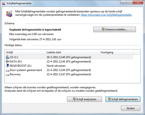 Interessant is de mogelijkheid om een defragmentatieschema in te stellen. In het hoofdvenster van Schijfdefragmentatie klikt u op de knop Schema instellen. Plaats een vinkje bij Gepland uitvoeren. Vervolgens geeft u aan hoe vaak de schijfdefragmentatie moet worden uitgevoerd (bij de optie Regelmaat). U kunt er bijvoorbeeld voor kiezen om de scan wekelijks of maandelijks uit te voeren. Bij Dag selecteren geeft u aan op welke dag de scan moet plaatsvinden en bij Tijd geeft u de gewenste tijd op. Tot slot geeft u aan welke schijven u onder handen wilt nemen. Klik daartoe op de knop Schijven selecteren. Schakel het selectievakje in voor elke schijf die u gepland wilt defragmenteren. Plaats ook een vinkje bij de optie Nieuwe schijven automatisch defragmenteren.