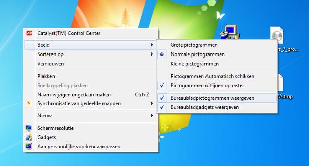 Wilt u even helemaal geen pictogrammen op het bureaublad zien? Verberg ze tijdelijk. Klik met rechts op het bureaublad en kies Beeld / Bureaubladpictogrammen weergeven (zodat het vinkje ernaast verdwijnt). De pictogrammen zijn nu verdwenen. U kunt ze overigens gewoon blijven gebruiken. Druk hiervoor op Windows-toets+E en open de map Bureaublad. Hier vindt u alle items. In Windows 7 kunt u ook de bureaubladgadgets tijdelijk verbergen. Klik daarvoor met rechts op het bureaublad en kies voor Beeld / Bureaubladgadgets weergeven.