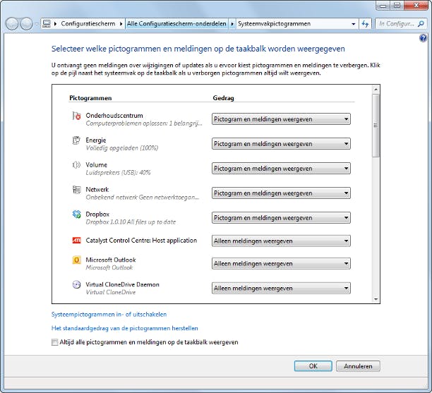 Het systeemvak (het gedeelte op de Windows-taakbalk bij de klok) kan meestal ook een opschoonbeurt gebruiken. Het is zonde om ruimte weg te geven aan pictogrammen van programma's die u nauwelijks gebruikt of waarvan u niet per se continu een pictogram hoeft te zien. Klik met rechts op de knop Start en kies Eigenschappen. Op het tabblad Taakbalk klikt u op de knop Aanpassen. Een overzicht met alle pictogrammen verschijnt. Gebruik de opties in de kolom Gedrag om het vak op te schonen. Bij pictogrammen die u nooit gebruikt, kiest u voor Verbergen.