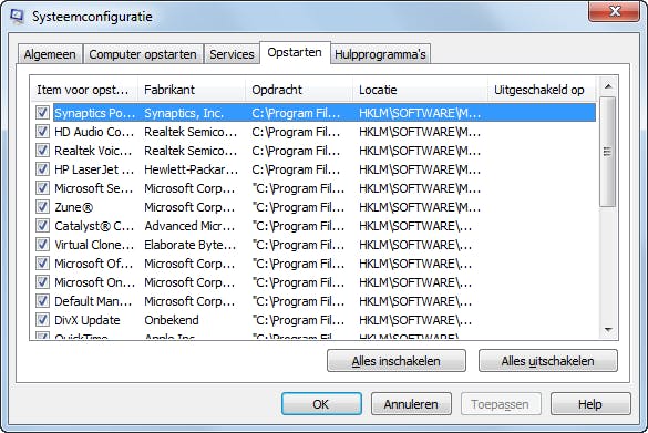 Met MSConfig kunt u nauwkeurig opvragen welke programma's bij het laden van Windows worden geladen. MSConfig is door de ontwikkelaars van Windows aardig verborgen. Kies Start / Uitvoeren, typ Msconfig en klik op OK. Via het tabblad Algemeen bepaalt u het opstartproces. Het meest interessant is echter het tabblad Services, dat een overzicht geeft van alle services die bij de start van Windows zijn geladen. Haal het vinkje bij een service weg als u wilt voorkomen dat deze wordt geladen. Uiteraard is dit alleen weggelegd voor de gevorderde gebruiker die de functie van de service kent. Het tabblad Opstarten laat zien welke componenten bij de start van Windows worden geladen. Ook hier geldt dat u het vinkje kunt weghalen bij onderdelen die u niet wilt gebruiken. Opgeruimd staat netjes!