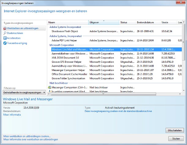 Vergeet niet om ook Internet Explorer op te schonen. Het opschonen van de tijdelijke internetbestanden is u waarschijnlijk al bekend, maar wist u dat het ook loont om de lijst met plug-ins (invoegtoepassingen) van Internet Explorer kritisch te bekijken? Hoe meer plug-ins, hoe trager de browser en hoe groter de kans op een instabiel systeem. In Internet Explorer 7 kiest u voor Extra / Invoegtoepassingen beheren / Invoegtoepassingen in- of uitschakelen. Er wordt nu een overzicht getoond. Kies bij Weergeven voor Invoegtoepassingen die op dit moment in Internet Explorer zijn geladen. Selecteer de invoegtoepassing die u niet nodig hebt en kies in het vak Instellingen voor Uitschakelen. In Internet Explorer 8 kiest u voor Extra / Invoegtoepassingen beheren. Kies links voor Werkbalken en uitbreidingen en kies bij Filteren op voor de optie Geïnstalleerde invoegtoepassingen. Selecteer de toepassing die u niet meer nodig hebt en klik op de knop Uitschakelen. Bent u niet zeker van uw zaak, dan controleert u bij Laadtijd hoeveel tijd het kost om de specifieke uitbreiding te laden. U vindt deze kolom uiterst rechts in het hoofdvenster.