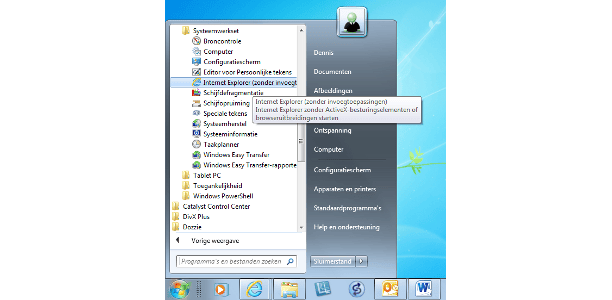 In Windows 7 vindt u de mogelijkheid om Internet Explorer zonder plug-ins te laden. Dat is handig als u snel wilt surfen zonder poespas, of als u problemen hebt met vervelende plug-ins. In het menu Start kiest u voor Alle programma's / Systeemwerkset / Internet Explorer (zonder invoegtoepassing). Er wordt nu een 'schone' versie van de browser geladen.