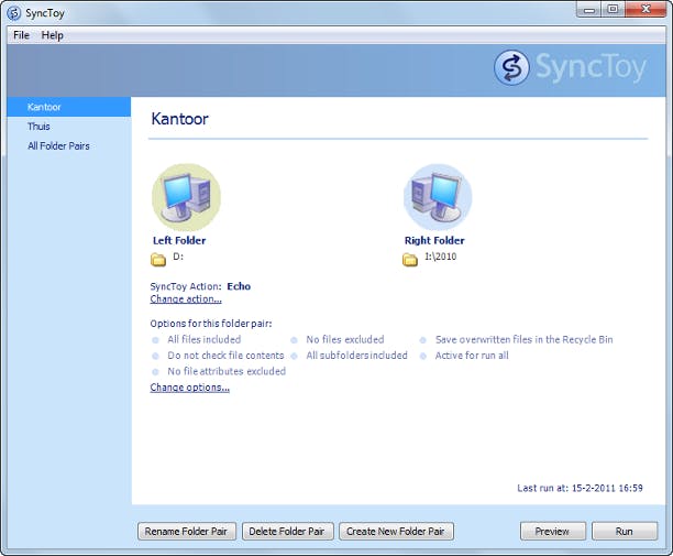 Nadat u SyncToy hebt gestart, kiest u voor Create New Folder Pair. Geef bij Left Folder de bronmap op. Bij Right Folder geeft u de doellocatie op (bijvoorbeeld een externe harde schijf). Bepaal hierna hoe de synchronisatie moet worden uitgevoerd. Kies tussen Synchronize (hierbij worden nieuwe en bijgewerkte bestanden naar beide mappen gekopieerd, inclusief naamswijzigingen en gewiste bestanden), Echo (hierbij worden nieuwe en bijgewerkte bestanden van links naar rechts gekopieerd, inclusief naamswijzigingen en gewiste bestanden), of Contribute (hierbij worden nieuwe en bijgewerkte bestanden van links naar rechts gekopieerd, gewiste bestanden blijven onaangetast). Klik op Next en voorzie het synchronisatiepaar van een passende naam. U keert nu terug naar het hoofdvenster. Klik op Preview (linksonder in het venster) om op voorhand te zien welk resultaat de automatische synchronisatie-actie heeft. Bent u hier niet tevreden over, dan kunt u de instellingen nog aanpassen. Tevreden? Klik op Run om de sychronisatie te laten starten.