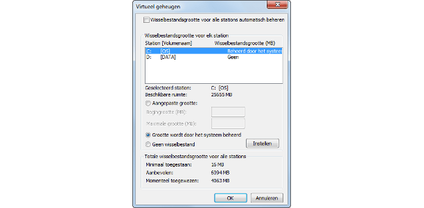 Windows 7 houdt zelf het beheer over het virtueel geheugen. Tenminste, als u dat wilt. U kunt het wisselbestand ook op een andere schijf plaatsen. Open het menu Start en klik met rechts op Computer, waarna u kiest voor Eigenschappen. Kies voor Geavanceerde systeeminstellingen (links in het venster). Op het tabblad Geavanceerd klikt u op de knop Instellingen (in het vak Prestaties). Kies vervolgens voor het tabblad Geavanceerd. In het vak Virtueel geheugen klikt u op de knop Wijzigen. Haal het vinkje weg bij Wisselbestandsgrootte voor alle stations automatisch beheren. Selecteer de schijf waarop u het wisselbestand wilt plaatsen en kies voor Aangepaste grootte (of Grootte wordt door het systeem beheerd, als u de minimale en maximale grootte niet wilt opgeven). Bevestig met een klik op Instellen. Selecteer vervolgens het station waarop het wisselbestand oorspronkelijk stond en kies voor Geen wisselbestand. Ook hier klikt u wederom op Instellen. Hebt u de instellingen gecontroleerd en bent u tevreden? Sluit het venster middels een druk op OK.