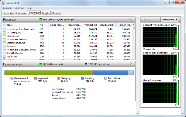 Als u Windows 7 gebruikt, kunt u met Broncontrole zien hoe de bronnen zijn verdeeld.