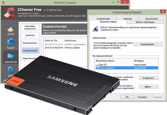 Windows-systeemherstelpunten kunnen je redding zijn als je computer crasht, maar ze nemen ook ruimte in beslag. Je kunt de maximale ruimte die je aan herstelpunten wilt opofferen eenvoudig bepalen. Druk op Windows-toets+Pause en ga naar Geavanceerde systeeminstellingen. Open het tabblad Systeembeveiliging en klik op de schijf waarvan je systeemherstel wilt aanpassen. Klik op Configureren en geef aan hoeveel ruimte je voor 'het vangnet' beschikbaar wilt stellen. Oude herstelpunten zijn het eenvoudigst te verwijderen met CCleaner. Open CCleaner en klik hier op Gereedschap / Systeemherstel voor een overzicht van je herstelpunten. Je kunt CCleaner ook uitstekend inzetten om je tijdelijke internetbestanden en andere overbodige resten op te sporen en verwijderen.