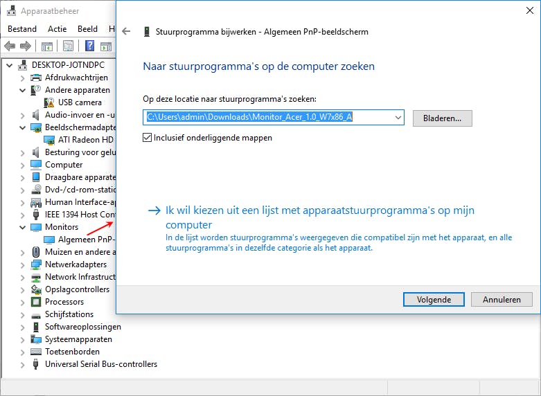 Normaal gesproken wordt ook tijdens de installatie van de monitordriver een ICC-profiel geïnstalleerd en aan je monitor gekoppeld. Dat is een bijkomende reden waarom het belangrijk is dat je de juiste en up-to-date driver voor je monitor installeert. Druk op Windows-toets+R en voer het commando devmgmt.msc uit. Dit brengt je naar het Apparaatbeheer. Open hier zowel de rubriek Beelschermadapters als Monitors en ga na of de meest geschikte driver is geïnstalleerd. Zie je bijvoorbeeld Algemeen PnP-beeldscherm staan bij Monitors dan wordt het generieke stuurprogramma van Microsoft gebruikt, en dat is uiteraard niet de beste keuze. We raden je aan om in eerste instantie op de site van de monitorfabrikant naar de bij jouw monitor behorende driver te zoeken, en die te installeren. Om dat laatste te doen, klik je met de rechtermuisknop op de huidige driver en kies je achtereenvolgens Stuurprogramma’s bijwerken en Op mijn computer naar stuurprogramma’s zoeken. Daarna verwijs je naar de gedownloade driver(map).