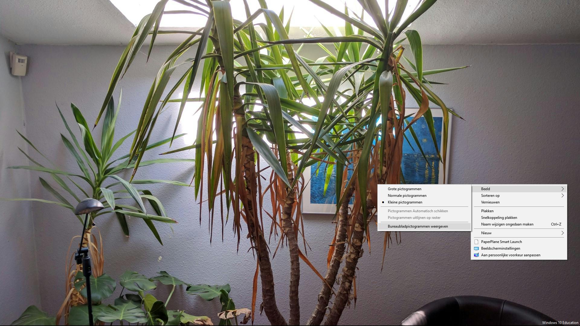 Staat je pc in het midden van een niet al te royaal bemeten ruimte, dan zorg je met een leuk trucje voor wat extra ‘ruimtelijkheid’. Zet de monitor even aan de kant en neem een foto van er wat zich achter de monitor bevond (bijvoorbeeld een plant op de vensterbank). Die foto stel je vervolgens in als bureaubladachtergrond. Dat doe je heel eenvoudig door het fotobestand met de rechtermuisknop aan te klikken en Als bureaubladachtergrond gebruiken te selecteren. Wanneer je nu naar je bureaublad kijkt, lijkt het haast alsof er geen monitor staat en heb je het gevoel dat je ruimte wat groter is geworden. Om het helemaal ‘echt’ te maken klik je op een lege plek op je bureaublad, kies je Beeld en verwijder je met een muisklik het vinkje bij Bureaubladpictogrammen weergeven.