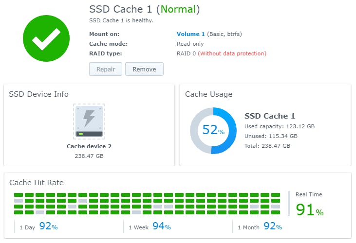 Twee jaar lang draaiden twee vergelijkbare nas-systemen, waarvan één met ssd-cache. Over de effectiviteit van de cachefunctie van onze Synology DS918+, een 4bay-nas met twee cache-ssd-sleuven, hebben we zeker niet te klagen. Na circa twee maanden gebruik kwam circa een derde van alle data die wij opvroegen van de cache en inmiddels is dat percentage naar boven de negentig procent gestegen. Hoewel dat uiteraard per gebruiksscenario zal verschillen, vinden we dat toch een erg positief teken. En dan hebben we het over slechts 256 GB aan ssd-cache op 32 TB aan harde schijven.