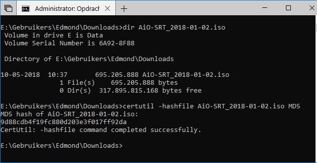 Open dan een Opdracht-prompt en verplaats de cursor naar de map Download. Met het commando certutil -hashfile AiO-SRT_2018_01-02.iso MD5 gevolgd door Enter kun je de MD5-hash van de gedownloade iso berekenen. Deze moet overeenkomen met de MD5 zoals die bij de download op de website staat aangegeven.