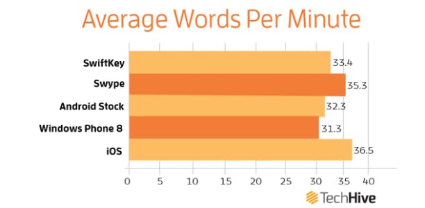 Als je waarde hecht aan snelheid bij het typen op een telefoon, dan is het iOS-toetsenbord waarschijnlijk iets voor jou. Met een gemiddelde typsnelheid van 36,5 woorden per minuut deed het iOS-toetsenbord het net iets beter dan haar rivalen op Android en Windows Phone. Het scheelde met een verschil van slechts 5,2 woorden per minuut niet veel tussen de winnaar (iOS) en de verliezer (Windows Phone). Het verschil was voor ons niet significant genoeg om iOS als definitieve winnaar uit te roepen in de categorie snelheid.