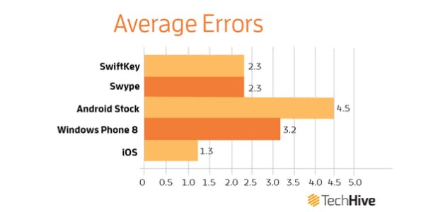 Het Windows Phone 8-toetsenbord deed het in dit onderdeel van de test iets beter dan het standaard Android-toetsenbord, maar zowel Swype als SwiftKey presteerden beter. En hoewel men graag klaagt over de agressieve autocorrectie van iOS, leek dit het aantal fouten van onze deelnemers bij het typen op het kleine iPhone-scherm prima te verminderen.