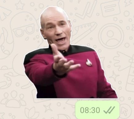 Stickers zijn -net als emoji- stilstaande afbeeldingen. Je kunt ze gebruiken als je bijvoorbeeld een meme (bekende internetgrap) wil gebruiken, zonder dat dit de ander teveel data kost. Een sticker is juist omdat hij stilstaat vaak geen grote aanslag op de data van de ander. Stel dus dat die persoon die zei dat het geldschip weer kwam binnenvaren, wel een sticker als antwoord verdient, dan zoek je bijvoorbeeld naar een stickerset die precies die ene sticker bevat met daarop Picard uit Star Trek die zijn arm uitstrekt op zo’n manier van: geef mij het geld. Dit is een bekend meme, dus er zullen op het internet meerdere stickersets zijn waar deze afbeelding in voorkomt. Vaak komen stickers wel beter tot hun recht wanneer je er nog iets bijschrijft.