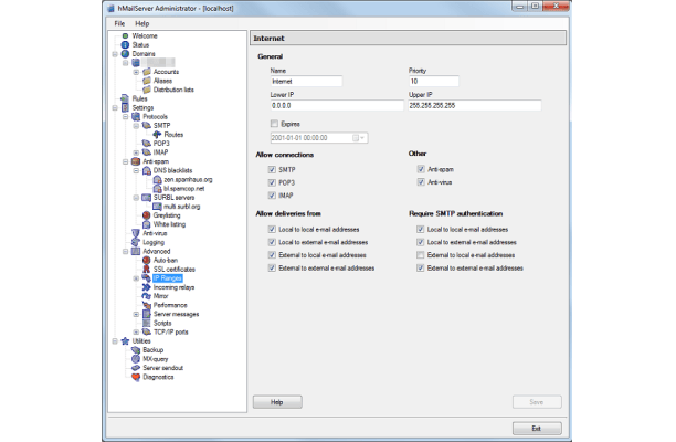 Verder is het mogelijk gebruikers te bannen na een (zelf te bepalen) aantal mislukte aanmeldpogingen, foutberichten aan te passen, een catch-all adres in te stellen, aan te geven van welke IP-adressen u welk soort connecties toelaat, enz.