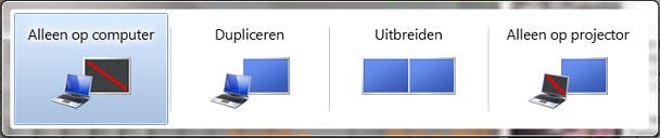 Houd de Windows-toets ingedrukt en druk op P. 1x P is het scherm zelf, 2x is dupliceren, 3x is uitbreiden en 4x is alleen op de beamer. Laat je de toetsen los, dan wordt de opdracht verwerkt. Je ziet onderstaand menu: