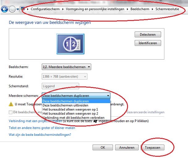 Veel moderne laptops identificeren een beamer (of een extern beeldscherm) direct en weten 'wat ze moeten doen'. Als de beamer aanstaat, detecteert hij de laptop als input-apparaat en het beeld verspringt direct van je scherm op de projectie van de beamer. Klaar!