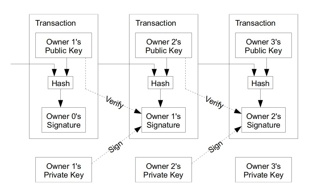 In Bitcoin heb je rekeningen waarnaar je geld kunt overschrijven. Een rekeningnummer of adres is een hash van een publieke sleutel, een lange reeks letters en cijfers. Een hash is een getal dat je maar in één richting kunt berekenen. De eigenaar van die rekening heeft de bijbehorende privésleutel en is dus de enige die dat geld kan uitgeven. Iedereen kan wel geld overmaken naar de rekening.