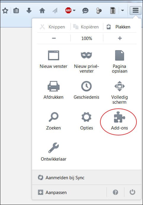 Open een Firefox-venster en klik helemaal rechts op de horizontale streepjes. Kies hier voor Add-ons. Je kan ook 'about:addons' (zonder aanhalingstekens) invoeren in de adresbalk.