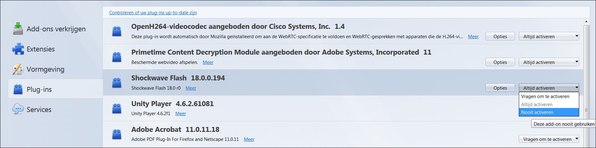 In dit nieuwe scherm zie je links verschillende opties. Kies voor Plug-ins. Nu zie je Shockwave Flash staan, met daarachter het versienummer. Rechts kies je in het dropdownmenu voor Nooit activeren.