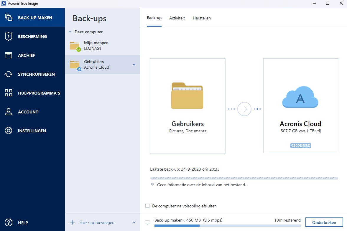 Duplicati is een gratis alternatief, dat tal van back-uplocaties ondersteunt. Acronis True Image biedt ook antivirus en cloudopslag, maar wel in een jaarabonnement. De back-ups moeten daarbij zeker niet op hetzelfde apparaat staan als waar de gegevens die in de back-up zitten. Beter worden de back-ups op een ander apparaat bewaard en het liefst offline. Dat betekent op een externe schijf of in de cloud. Alleen een back-up die niet toegankelijk is voor buitenstaanders, is immers veilig voor ransomware.