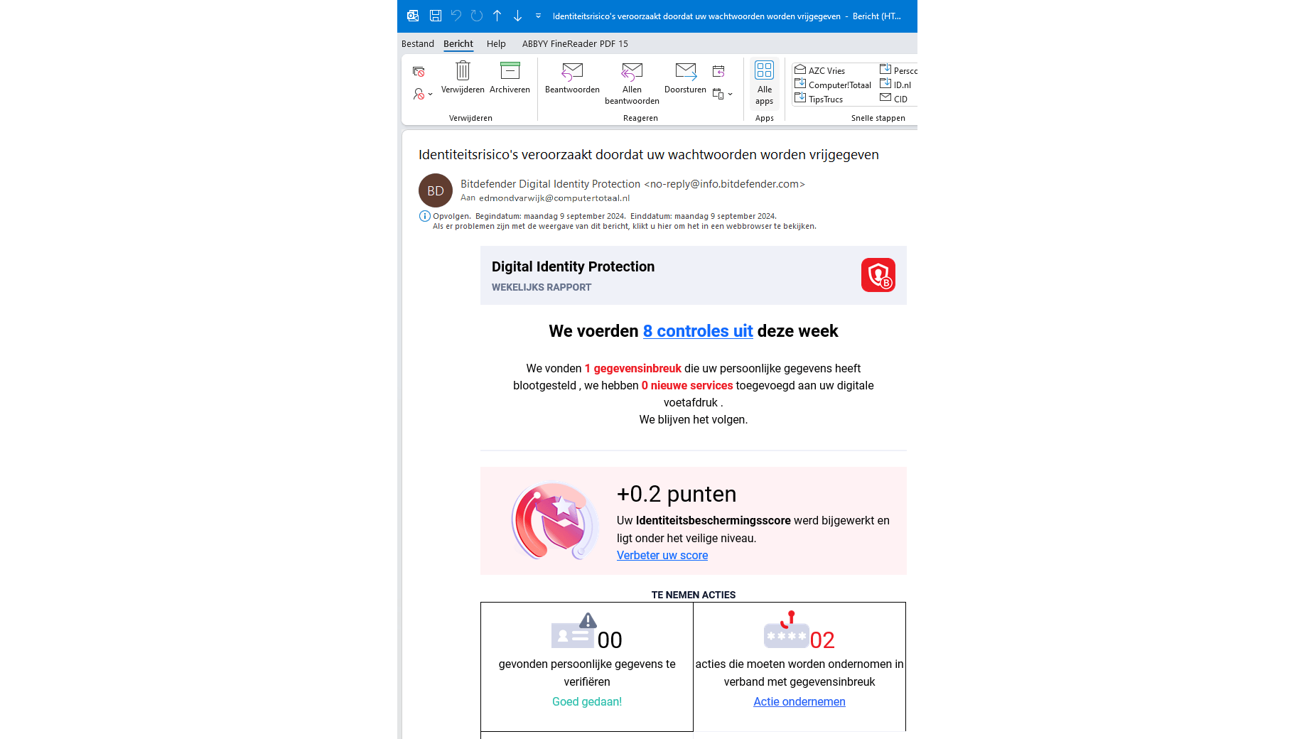 Veel antivirusprogramma’s bieden functionaliteit zoals anti-phishing, bescherming tegen frauduleuze websites en controle op gelekte identiteits-informatie op het darkweb. Voor de laatste analyseren zij datasets uit datalekken. Alternatief kun je dit ook zelf controleren op have i been pwned? en daar voor een of meer mailadressen ook een alert instellen, zodat je melding krijgt als jouw gegevens worden gevonden.