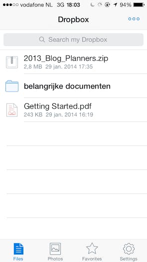 Bovenin kun je mappen maken, zoals je hieronder ziet bij 'Belangrijke documenten'. Om een bestand op Dropbox te zetten, ga je naar het icoon met een pagina en druk je hier op. Dan kun je daarna een bestand kiezen en uploaden.
