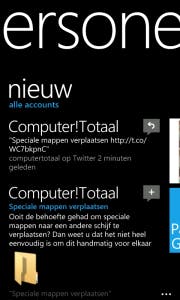 Windows Phone 7.5 probeert - meer dan elk ander mobiel besturingssysteem - om alle communicatie samen te smelten. Het ultieme voorbeeld hiervan is de personen-hub, het 'telefoonboek' van Windows Phone dat alle contactpersonen uit al uw bronnen (zoals e-mail, Facebook, LinkedIn en Twitter) samenbrengt in één lijst. Van contactpersonen die in meerdere netwerken voorkomen wordt de informatie aan elkaar geknoopt. U kunt dan door op een contactpersoon te klikken hem opbellen, maar ook een berichtje op zijn Facebook-wall zetten. Mocht uw contactpersonenlijst te onoverzichtelijk worden door bijvoorbeeld uw Facebook-contacten of LinkedIn-contacten, dan kunt u contacten per bron verbergen. De personen-hub toont ook uw Facebook-wall, uw Twitter-account en LinkedIn-account zodat u op de hoogte bent van alle updates. U kunt ook losse contactpersonen of groepen vastpinnen aan uw startscherm, waarna dit pictogram functioneert als personen-hub voor alleen die contactpersoon of groep. Zo kunt u losse mensen of groepen mensen eenvoudig volgen op al hun sociale netwerken.