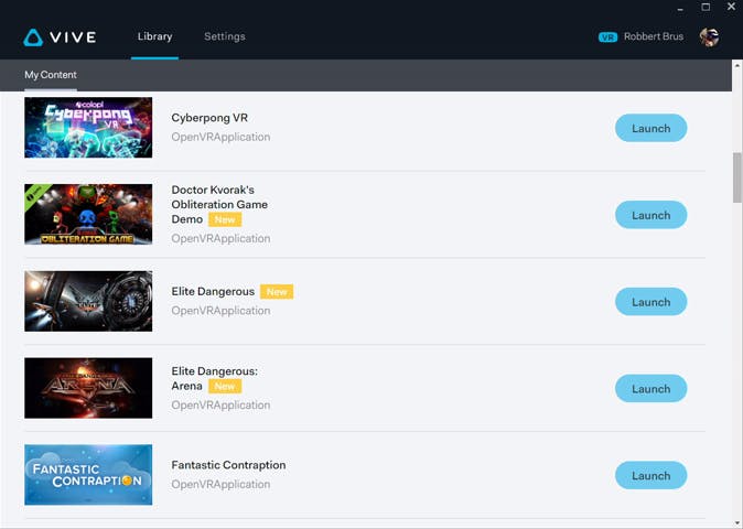 Spellen voor de Vive download je via Steam. Heb je al een aardige bibliotheek dan kan het lastig zijn om al je VR-games te vinden. Gelukkig heeft HTC als alternatief een eigen softwareomgeving ontwikkeld die slechts de VR-spellen uit je Steam-bibliotheek toont. Ook kun je hier de instellingen van de Vive wijzigen en een telefoon koppelen aan de Vive. Zo kun je berichten van je telefoon in je VR-headset binnen moeten zien komen. Helaas zit er op dit moment een bug in de software waardoor we deze feature niet konden testen.
