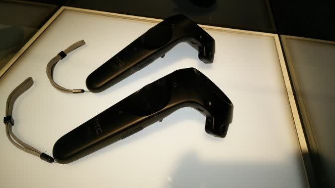 HTC levert twee losse controllers mee, die wat weghebben van de oude joysticks van vroeger. Er zitten triggers aan de achterkant, en een aanraakgevoelige vierpuntsdruktoets bij je duimen. De controllers zijn draadloos en worden verbonden met de headset - waarvan het overigens wel weer jammer is dat die wel met een draad vast zit.