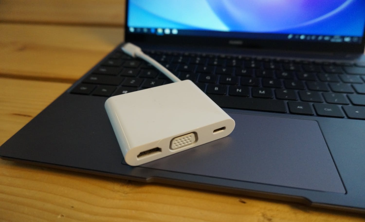 Beide usb-c-poorten ondersteunen uiteraard wel dataoverdracht. Helaas wordt de snelste vorm van usb 3.1, Gen 2, of Thunderbolt 3 niet ondersteund. Dit is een groot verschil met de MateBook X Pro die wel Thunderbolt aan boord heeft. Huawei levert netjes een usb-c-dongle met usb-a, usb-c, hdmi en vga mee, dus je kunt je bestaande apparatuur zonder extra kosten aansluiten.