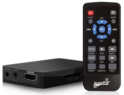 IconBIT is een fabrikant van mediaspelers die bij ons nog onbekend is, maar in Rusland tot de grote spelers behoort. Sinds kort wordt het merk ook in Nederland vertegenwoordigd en het eerste product dat we van iconBIT kregen om te testen, is de HTravel T. Het meest opvallende aan deze mediaspeler is zijn formaat, met een afmeting van 8,4 bij 5,3 centimeter is hij qua oppervlakte net zo groot als een bankpasje (alleen wat dikker). De platte afstandsbediening is zelfs groter dan de speler zelf. De platte afstandsbediening werkt op een knoopcelbatterij.