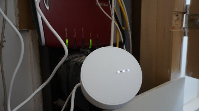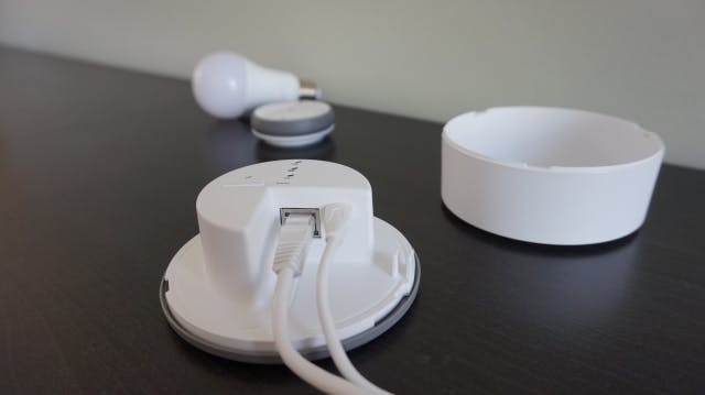 Wanneer je met de prijscategorie de slimme verlichting aantrekkelijk maakt voor een groter publiek, is het natuurlijk ook zaak de installatie zo eenvoudig mogelijk te maken. Ook dat is gelukt. Je sluit het basisstation bekabeld aan je netwerk aan en voorziet deze van stroom via een micro-usb-aansluiting (beide kabels zitten overigens gewoon in de set). Je hoeft dit basisstation overigens niet pontificaal in de huiskamer hebben staan. Nadat ik de lampen gekoppeld had, heb ik het basisstation gewoon uit het zicht in de meterkast kunnen plaatsen. Houd hierbij wel rekening met de reikte van de afstandsbediening.