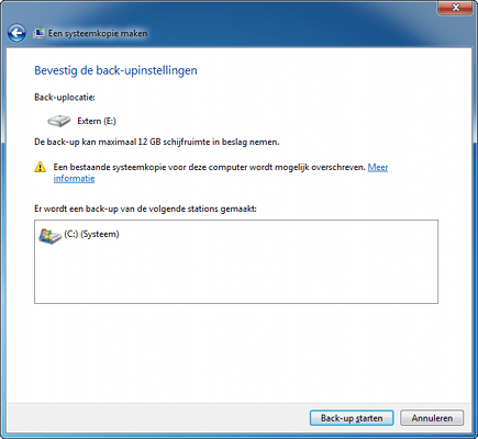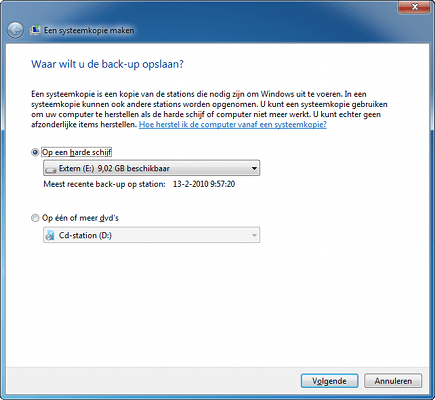 Een systeemkopie kan Windows Back-up bewaren op een harde schijf of één of meer dvd's.