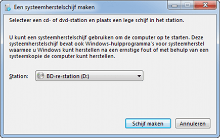 Is de systeemkopie eenmaal gemaakt, dan zal Windows Back-up aanbieden een systeemhersteldisk te maken. Dit is een cd of dvd waarmee u uw pc kunt opstarten om in geval van problemen het systeem te herstellen. Het is erg handig om een dergelijke schijf te hebben, dus klik op Ja. Leg een lege cd of dvd in de dvd-brander en klik op Schijf maken. Zodra het schijfje is gebrand, adviseert Windows u de disk te voorzien van een duidelijk label en te bewaren voor slechtere tijden.