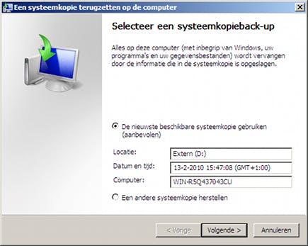 Werkt Windows niet meer correct, gebruik dan een eerder gemaakte systeemkopie om het systeem te herstellen. Plaats de herstelschijf in de cd- of dvd-speler en kies ervoor de computer vanaf deze disk op te starten. De opstartvolgorde regelt u in het BIOS. Selecteer de juiste toetsenbordindeling (in de meeste gevallen zal dit 'Verenigde Staten (internationaal)' zijn). Klik op Volgende. Het hulpprogramma voor systeemherstel gaat op zoek naar een back-up die kan helpen bij het oplossen van de Windows-problemen. Standaard kiest het daarbij voor de laatste kopie, maar via Computer met behulp van een eerder gemaakte systeemkopie kunt u ook een andere systeemkopie kiezen, mocht dat noodzakelijk zijn. Klik op Volgende en kies Herstellen met systeeminstallatiekopie.