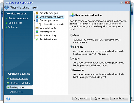 Belangrijker zijn de back-upopties, zoals het beveiligen van de back-up met een wachtwoord en versleuteling en de compressieverhouding. Handig is de optie een beschrijving toe te voegen, waarin u vermeldt waarom en wanneer de back-up is gemaakt en welke bestanden u hebt meegenomen.