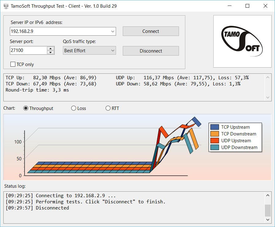 Ga nu naar een andere pc en installeer daar ook de Throughput Test. Open daar via je startmenu Run Server. Noteer het IP-adres van de server, dat je ziet bij Listening on port 27100 at the following IP address: [IP-adres]. Neem dat IP-adres over en vul het in bij de client bij Server IP or IPv6 address. Klik op Connect. Er worden nu tests uitgevoerd. Je kunt de tests zelf stoppen door op Disconnect te klikken. Je ziet eerst de maximumsnelheiden en de gemiddelde snelheden. Als je wifi werkt op 802.11n, is alles tussen de 50 tot 300 Mb/sec een normale snelheid, afhankelijk van hoe dicht de apparaten bij de router zijn. Heb je veel lagere snelheden, dan kan het nodig zijn om het wifi-kanaal te wijzigen, de router op een betere locatie te plaatsen, te testen met minder aangesloten apparaten of wordt het tijd voor een nieuwe router.