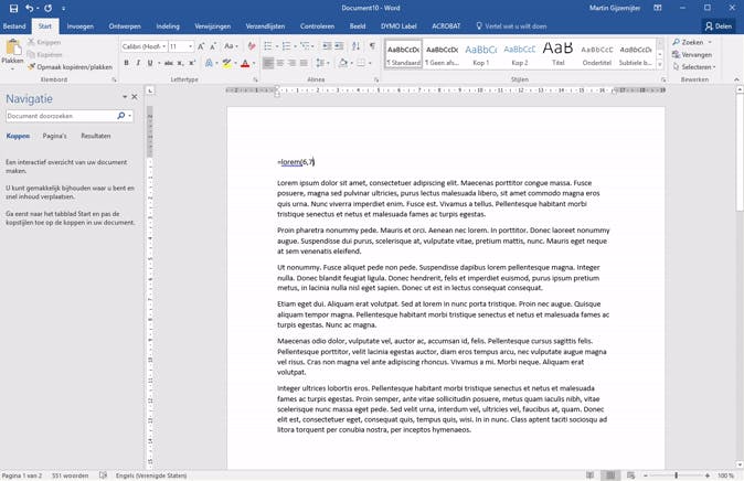 Soms ben je bezig met een tekst en moet je even een paragraaf of een hoofdstuk opvullen met neptekst omdat je de definitieve tekst nog niet hebt. Daarbij moet het echter wél duidelijk zijn dat de tekst neptekst is (om te voorkomen dat het document wordt verstuurd naar mensen terwijl het nog niet definitief is) en om die reden gebruiken we daar vaak een stuk Latijn voor (het beroemde Lorem ipsum). Iedereen die Lorem ipsum-tekst ziet, weet dat het om opvultekst gaat. Als je gebruikmaakt van deze methode, ga je waarschijnlijk meestal naar een website waar je de tekst vandaan plukt. Dat hoeft helemaal niet, want Word heeft zelf een Lorem ipsum-generator ingebouwd. Het enige dat je hoeft te doen is =lorem(p,l) te typen, waarbij je p vervangt door het aantal paragrafen dat je wilt genereren en l door het aantal zinnen. Zodra je op Enter drukt wordt de tekst gegenereerd.