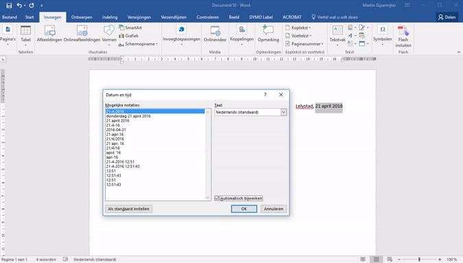 Het mooie van Word is dat het programma allerlei dingen automatisch voor ons kan doen. Automatisch is fijn, want dat voorkomt dat er fouten gemaakt worden. Stel dat er een brief is die je elke week verstuurt naar verschillende mensen (bijvoorbeeld voor de vereniging waarvoor je actief bent). Dan moet je elke week de datum die bovenaan die brief staat aanpassen. Dat gaat negen van de tien keer goed, maar er komt een dag dat je het vergeet. Geen ramp, maar wel slordig ... én onnodig, want Word kan dit automatisch voor je doen. Klik boven het lint op het tabblad Invoegen en klik vervolgens in het vakje Tekst (derde van rechts) op Datum en tijd (het pictogram met de kalender en het klokje). Je kunt nu kiezen in wat voor notatie je de datum en tijd wilt invoegen, en alleen de datum of alleen de tijd kan ook. Zorg ervoor dat je het vakje bij Automatisch bijwerken aanvinkt. Elke keer dat je het document vanaf nu opent, zal dit veld automatisch worden bijgewerkt.