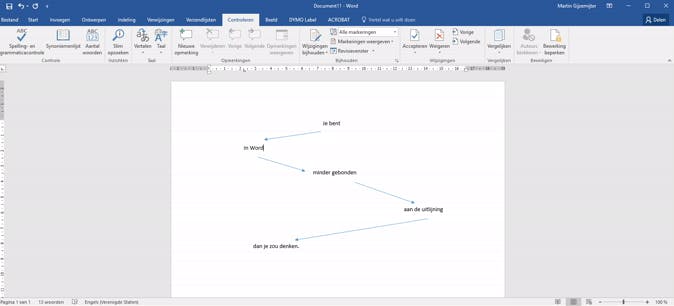 Een functie in Word die al héél lang aanwezig is, is de mogelijkheid om overal waar je maar wilt een zin te beginnen. Afhankelijk van de uitlijning van je tekst, begint een regel standaard links, in het midden of rechts (tenzij je een tekstkader gebruikt). Het lijkt alsof je dit niet verder kunt aanpassen, maar in werkelijkheid kun je beginnen met typen waar je maar wilt. Wanneer je namelijk dubbelklikt op een willekeurige locatie in een Word-document, dan zal de muisaanwijzer precies naar die plek verspringen en kun je gewoon midden in het document een woord of een zin typen. Denk daar wat pijlen bij en je hebt een uitstekende brainstorm/mindmapping-tool in Word. Klein nadeel: het verplaatsen van dit soort teksten is niet zo eenvoudig als het verplaatsen van tekstvakken.
